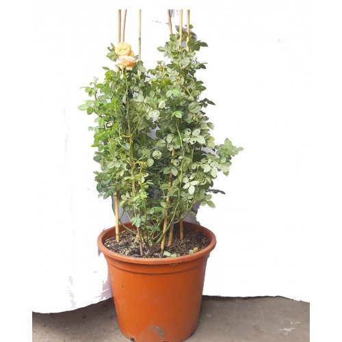 Chậu hoa hồng leo Phương Nam có chiều cao từ 60 - 80 cm, cây phát triển tốt, cành lá sum xuê.