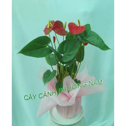 - Chậu cây hồng môn Phương Nam có đặc tính sinh trưởng mạnh và khả năng kháng nhiều loại sâu bệnh tốt. Cây được trồng trong chậu thủy tinh nhỏ, dễ dàng di chuyển và đặt tại nhiều khu vực trong gia đình.