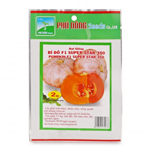 - Hạt giống bí đỏ F1 Super Star 350 Phú Nông 2g có đặc tính sinh trưởng mạnh và khả năng kháng nhiều loại sâu bệnh tốt. Sản phẩm cây trồng cho năng suất chất lượng và hiệu quả kinh tế cao.