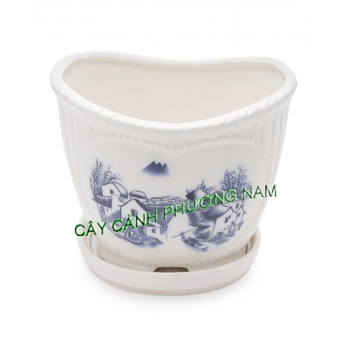 - Chậu có kiểu dáng oval cùng đĩa lót tiện lợi với hình ảnh làng quê thanh bình, màu sắc sang trọng, tinh tế sẽ tạo nét thẩm mỹ cho không gian sống nhà bạn.