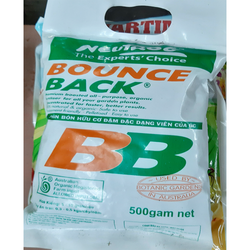- Phân bón hữu cơ Bounce Back Neutrog 500g là loại phân bón hữu cơ đậm đặc được sản xuất tại Úc theo quy trình công nghệ tiên tiến, chất lượng cao. Sản phẩm được cấp giấy chứng nhận chất lượng của Hội Nông Dân Sinh Học Úc (BFA), được Bộ Nông nghiệp và Phát triển nông thôn Việt Nam cho phép sử dụng rộng rãi trong nông nghiệp.